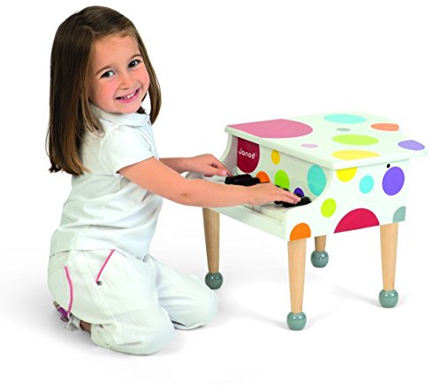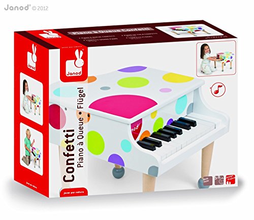 Janod Grand Piano is great fun for your budding musician. Brightly colored confetti polka dots adorn this beautifully crafted wooden toy piano that makes lovely music when you play it. It's a great addition to any room in the house. Recommended for children aged 3-8 years old.