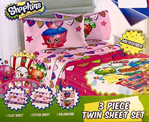 Shopkins 3 piece sheet set includes one flat sheet, one fitted sheet and one pillowcase. 100% polyester