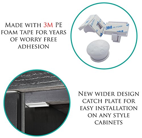 - INSTALLS IN MINUTES WITH SUPERIOR 3M ADHESIVE: Babyproof your home in minutes without tools or damage. 3M adhesive will hold securely through the years and will remove without damage. Wider latching system is made for a simple install and worry free safety!