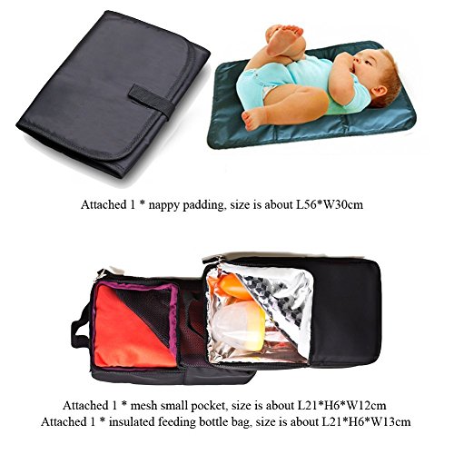- 【付属品】オムツ換えシート付(56×30CM)、保温哺乳瓶ポーチ付(13×21×6CM)、メッシュ収納ポーチ付(12×21×6CM)