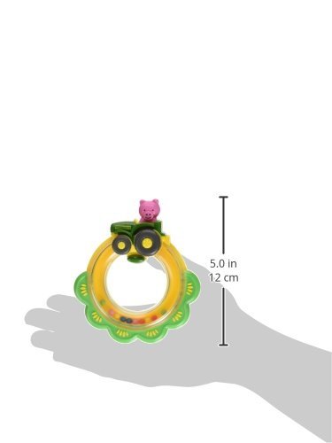 The John Deere Tractor Ring Rattle makes a ratcheting sound when moved back and forth. Beads shake to make rattling noises. Teeth able. Ages 3 months and up. Helps develop fine motor skills as baby moves the tractor back and forth and has the beads chase around the circular ring. Easy to grasp for soft teething. Ring shape rattle has a tractor that clicks as it drives back and forth. Scallops are softly over molded for teething. Measures approx. 4. 25"Dia. Ages 3 MThs +Tractor makes ratcheting sounds when moved back and forth Beads shake to make rattle noises Also can be used as a teetherFun John Deere theme Ages 3 months and up 2. 4 ounces; From the Manufacturer; The John Deere Tractor Ring Rattle makes a ratcheting sound when moved back and forth. Beads shake to make rattling noises. Teeth able. Ages 3 months and up.
