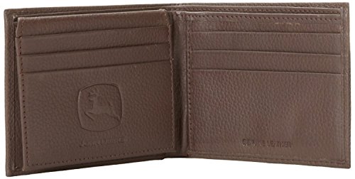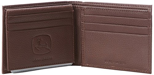 Soft, duable, pebble grain letather passcase wallet with John Deere rubber patch logo. Features 'extra page' compartment with clear ID thumb window, six credit card pockets, currency pocket and four plastic picture windows. Officially licensed John Deere product.