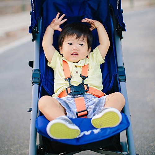 Lightweight graphite aluminum frame with non-pinch hinges; designed to support growing children;Compact umbrella fold, convenient shoulder strap;Generous canopy with sun visor and peekaboo window;Multi-position recline and adjustable footrest;5-point harness and reflective safety accents