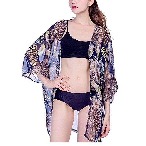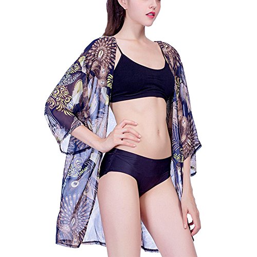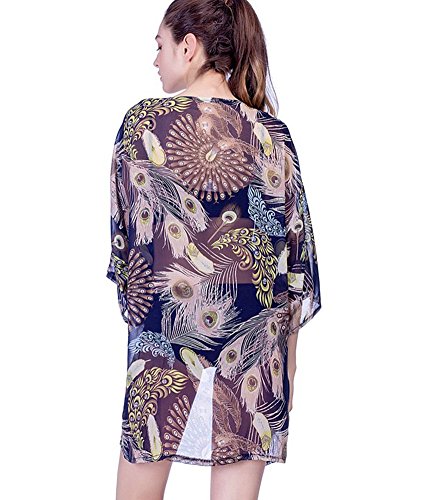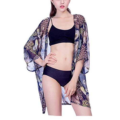 レディース花柄シフォンレース7分袖カーディガンゆったり薄手UVカットアウター冷房対策夏 (ダークブルー)