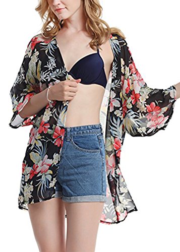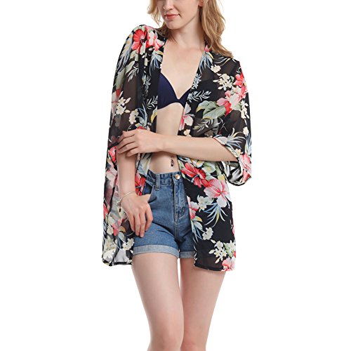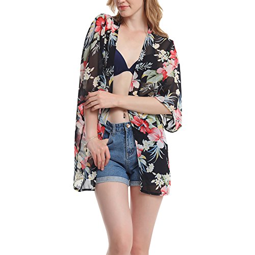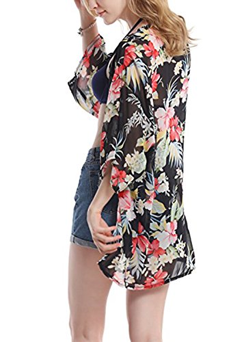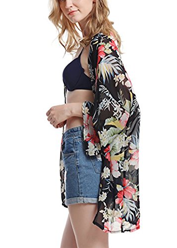 レディース花柄シフォンレース7分袖カーディガンゆったり薄手UVカットアウター冷房対策夏 (ブラック)