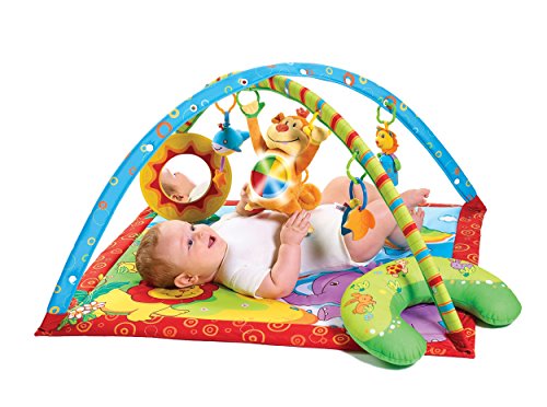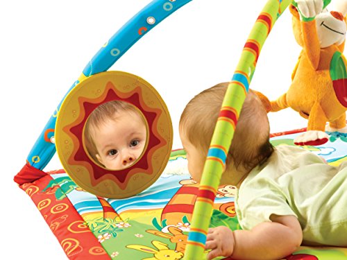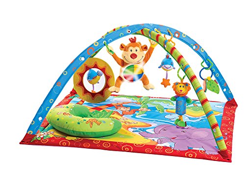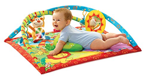 The Gymini Monkey Island offers baby a colourful and interacting gym in 3 stages: on back, tummy and seated upright. Back-time, a colourful padded mat with stimulating toys on arches for overhead play. Tummy-time, lowering the adjustable arches makes the transition to tummy-time easy. A comfortable pillow and mirror will encourage baby to spend time on her tummy whilst strengthening the neck and shoulder muscles. Tap & Play, the touch sensitive monkey will delight baby with pleasant tunes, sounds and lights when tapped. The monkey can be used throughout all stages.