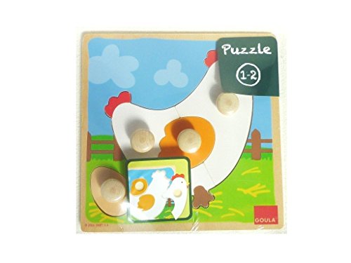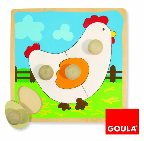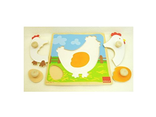 This beautiful 4 piece wooden chicken puzzle has been designed to stimulate the imagination of young children as they match the correct wooden puzzle pieces to the colourful background of the puzzle board.Children have to try and match the correct puzzle pieces to the outline of the fish on the puzzle board by matching up the correct shape of the chicken's face & upper body, wing, feet & behind and the egg beneath it. All the puzzle pieces are extra thick - making is perfect for small hands to enjoy picking up and placing into the correct backgrounds on the puzzle board. This fantastic four piece wooden puzzle develops sensory perception and hand-eye coordination skills in young children from a young age whilst they are having fun - because that is what learning is about.The wooden Farm puzzle is suitable for children aged 1-2 but is advised to be enjoyed under adult supervision. The puzzle board measures 22 x 22cm approximately. All our Goula products are designed and manufactured to the highest standards, using wood from plantations for sustainable use and non-toxic paints and lacquers. Wood is a biodegradable material in harmony with nature. Its texture, shape, volume and warmth make it suitable material for children of a young age.
