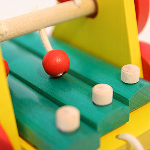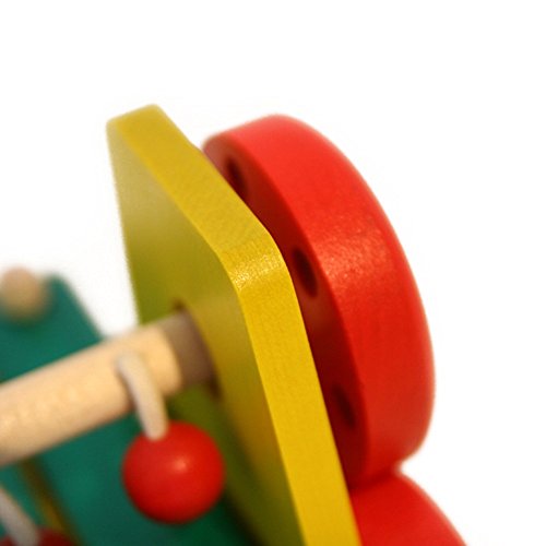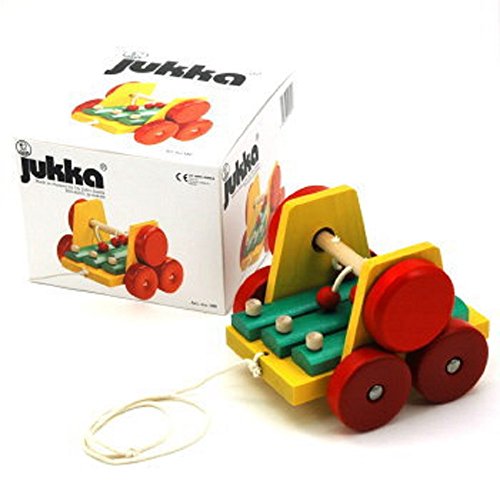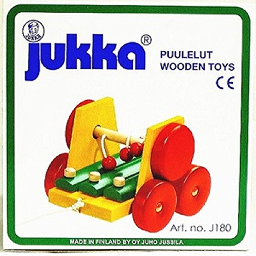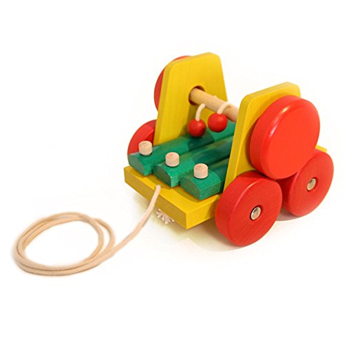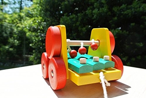 この「サウンドワゴン」は紐を引っ張ると木玉のぶらさがっている軸が車輪と連動して回転し、紐の先についている木の玉が木琴をたたきます。素朴できれいな音が響きます。