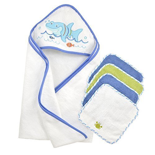 Just Born Just Bath Love to Bathe Knit 5-Piece Hooded Towel and Washcloth Set, Shark