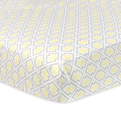 Measures 28 x 52 and fits all standard crib mattresses;Fully encased elastic edge provides snug and secure fit on mattress;Contemporary grey and yellow print;Coordinates with crib bedding sets and other accessories in Just Born bedding collections;Machine wash and dry for easy care