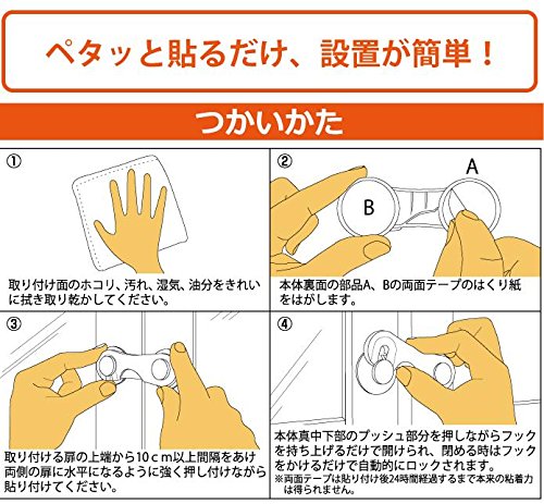 両面テープで貼り付けるだけ!(しっかり貼れて、きれいに取れるテープを使用しています)。凸凹のない両開きの扉なら、ガラス以外にも使用できます。本体真中下部のプッシュ部を押しながらフックを持ち上げるだけで開けられます。閉めるときは、フックを下すだけで自動ロックされます。