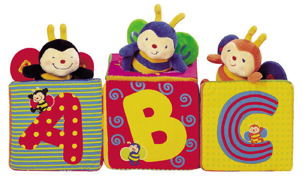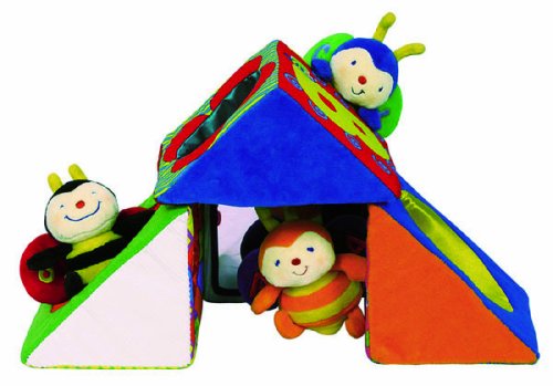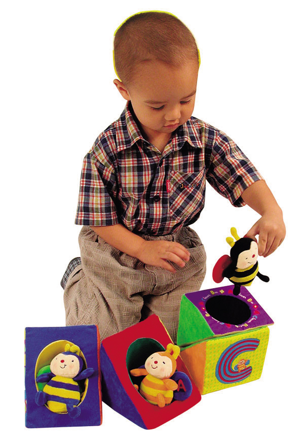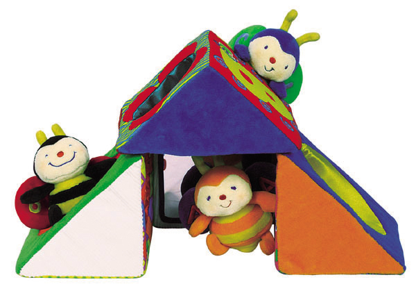4つのトンネルつき三角ブロックは、想像力を育む。 3匹のハチさんをトンネルに入れてみよう。
