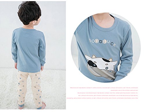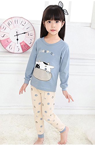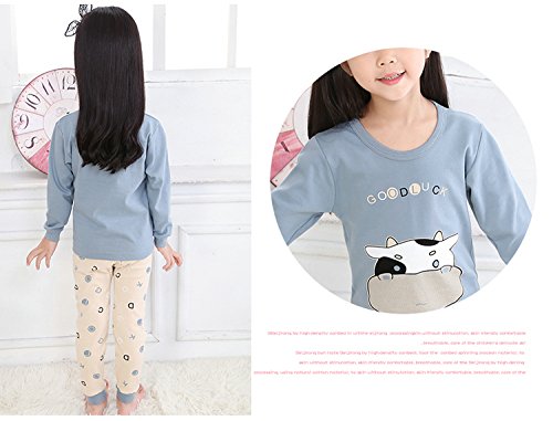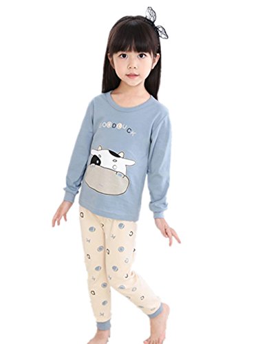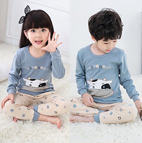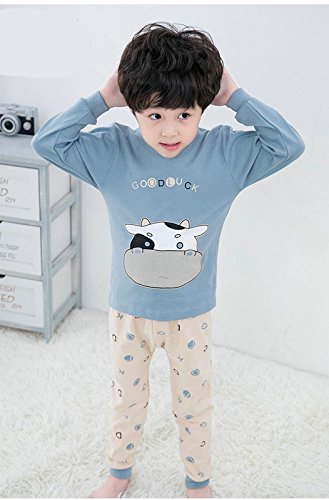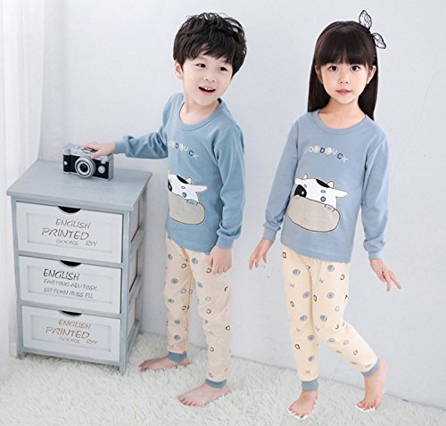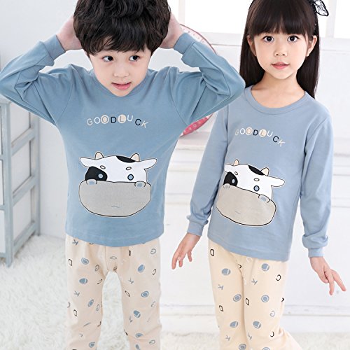 K+Mee 子供服 女の子 男の子 ルームウェア 寝間着 パジャマ 部屋着 長袖 春秋冬 乳牛柄 ベアー柄 くま柄 ボーイズ ガールズ 綿素材 柔らか 着心地 かわいい おしゃれ 人気 チュニック+ズボン 上下2点セット (ブルー乳牛 100cm)
