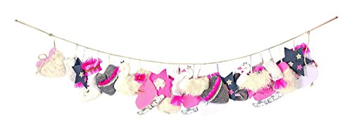 Celebrate the countdown to Kris Kringle's arrival with this splendidly unique Kathe Kruse swan lake advent calendar. Echoing the swan lake ballet, this advent calendar features pockets inside plush, holiday-detailed swans, stars, stocking, and hearts in rosy pinks and dove grays. Children can experience and enjoy a treat-filled plush pocket dangling on a decorative cord to countdown each day until December 25th. The Swan lake advent calendar comes with an 80' cord and 25 festive 6' pocket pieces. The advent calendar is suitable for kids age 3 years and up. For over 100 years Kathe Kruse has made toys and dolls that encourage creativity, foster early learning, and promote cooperative playing.