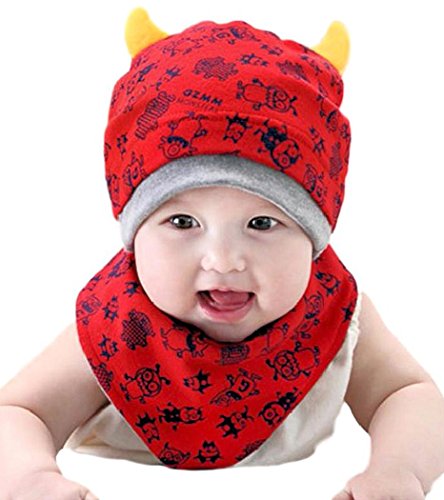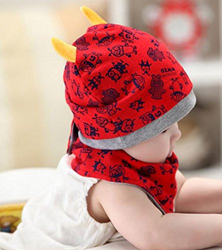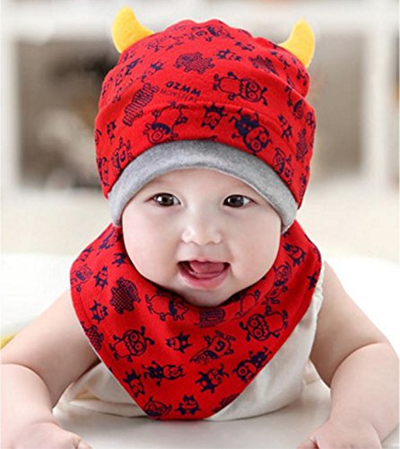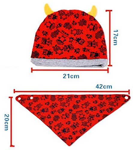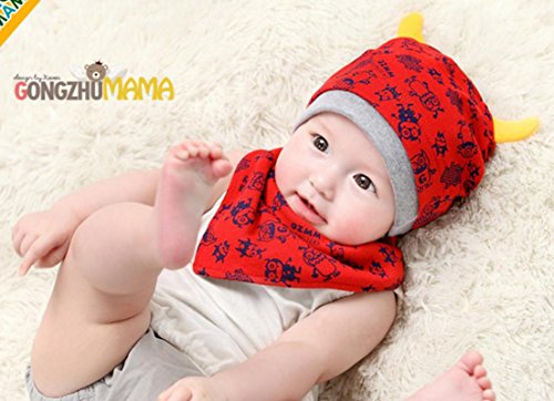 (ケイグラッソ)K-grasso+ ベビー 帽子 + スタイ 2点 セット かわいい モンスター 柄 角付き フライス プレゼント 出産祝い ギフト お祝い 新生児 赤ちゃん キッズ ぼうし キャップ ハット よだれかけ 子供 用 男の子 ボーイズ ユニセックス (01. レッド)