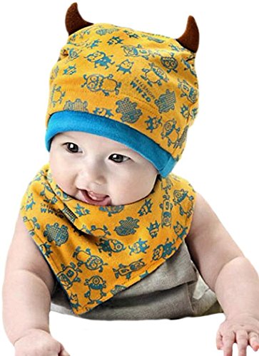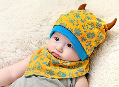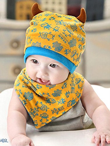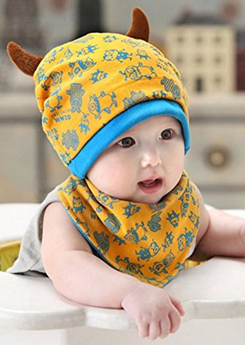 (ケイグラッソ)K-grasso+ ベビー 帽子 + スタイ 2点 セット かわいい モンスター 柄 角付き フライス プレゼント 出産祝い ギフト お祝い 新生児 赤ちゃん キッズ ぼうし キャップ ハット よだれかけ 子供 用 男の子 ボーイズ ユニセックス (03. イエロー)