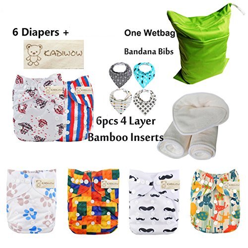 - KADIWOW Baby Pack Pocket Washable Adjustable Cloth Diaper 6PCS + 6PCS 4 Layer Bamboo Inserts+ 4PCS Bandana Bibs+Wet / Dry Bag (Neutral Color2)