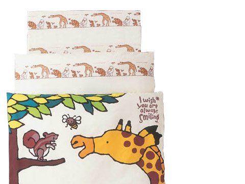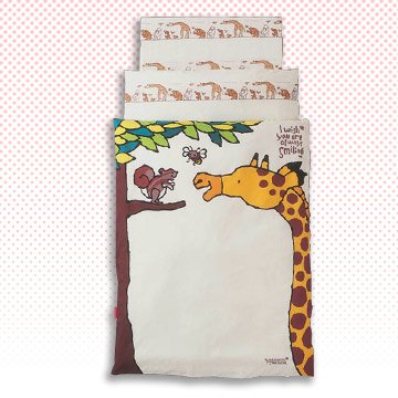 キリンとリス、それにミツバチのかわいいイラストが入った、おしゃれなベビーふとん6点セットです。