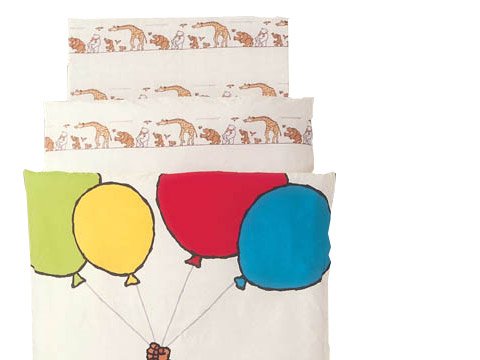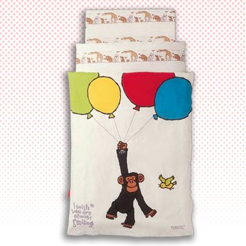 サルと小鳥のかわいいイラストが入った、おしゃれなベビーふとん6点セットです。