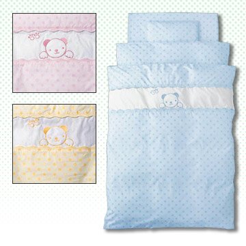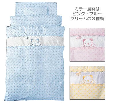かわいいクマのイラストがついた、やさしい色合いのベビーふとん7点セットです。