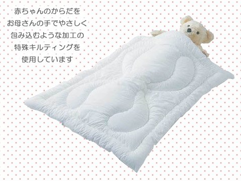 掛ふとんはローズベビースリープキルティング。ななめに入った波状キルティングが、赤ちゃんのからだにぴったりフィットし、しっかり包み込みます。