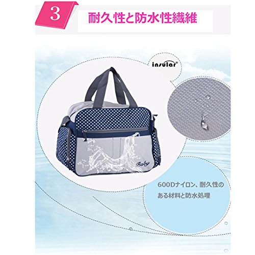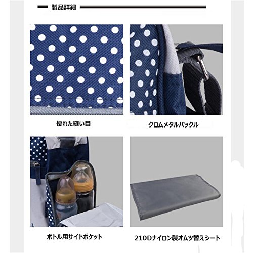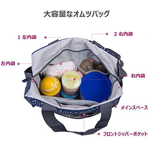 - 【収納】 収納スペースがとっても充実で整理整頓が簡単です。バッグ内ポケット3か所(タオル、オムツ、ボトルなど別々に置く可能)./外ポケット4か所(フロントファスナーポケットx1、サイドファスナーポケットx2、背当てオープンポケットx1)。とても便利なマザーズバッグです