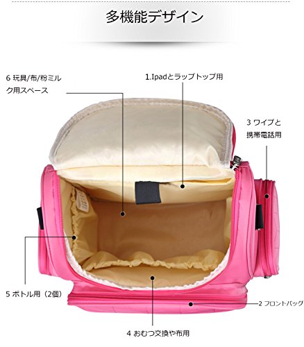 複数のポケットと内部の仕切りがある。お子様のオムツや哺乳瓶、粉ミルク、衣類などが全部入れる。食べ物と日常生活品を別々に収納するから、衛生的できちんとしている。