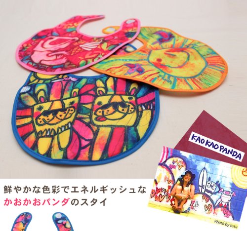 - 自然のエネルギーを受けてパワーいっぱいに描かれた、かおかおパンダのアートを施したデザインビブです。