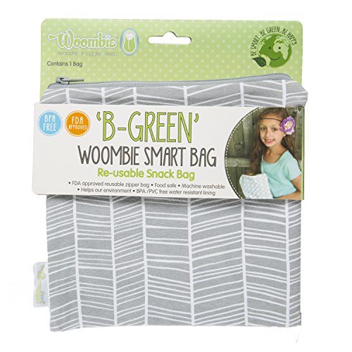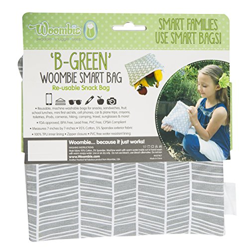 BE GREEN WITH OUR SMART BAG - The Woombie B-Green Smart Bag is fashionable, versatile, and eco-friendly. It features a dependable zipper for easy opening and closing, a water-resistant exterior, and a food-safe interior. It's reusable for more savings and less waste, and it's designed for a variety of applications. Forget snack bags-think smart bags! Keep food clean, protect valuable objects, and travel care free.;PERFECT FOR TRIPS AND PICNICS - The perfect place to pack fruit, vegetables, snacks, sandwiches, and school lunches, the B-Green Smart Bag is a great everyday option. It fits right in at school, the office, or the park, and can also be used for first aid kits, cell phones, toiletries, plane trips, baby toys, cameras, sunglasses, and more.;REUSABLE AND MACHINE WASHABLE - Not only does the B-Green Smart Bag allow you to save on disposable plastic bag purchases, it also helps save the planet and is hassle free. For easy maintenance, it can be hand washed or turned inside out and washed in the dishwasher. Line or air dry only. Do not use bleach.;SAFE AND FDA APPROVED - The Woombie B-Green Smart Bag features a PVC-free 100% TPU inner lining. It is FDA approved, BPA-free, lead-free, and PVC-free, and is also CPSIA compliant. Like all Woombie products, the B-Green Smart Bag is practical and quality-made.;PRODUCT SPECIFICATIONS - Package includes (1) Woombie B-Green Smart Bag. Dimensions: 7 x 7 inches. Material: 95% cotton, 5% spandex.