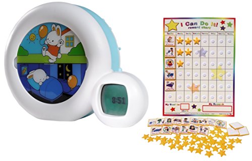 The Kid'Sleep moon helps kids stay in bed until it is time to get up;The Kid'Sleep moon offers the smart sunset go to sleep function and the smart moonset wake up process, which gives kids a 10 minute warning for sleep time and get up time;The Kid'Sleep moon has 3 settings for nighttime, nap and weekend, 4 choices of alarm sounds (or the choice of no alarm), and 4 levels of brightness to choose from;The Kid'Sleep moon helps children fall asleep with 4 different choices of lullabies. Color recognition is not required;There are 20 different, colorful chores and behaviors to choose from in your chart! It comes with 45 reusable plastic stars that kids love to earn!