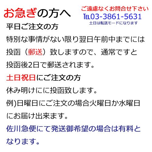 通常2-4営業日程度です。お急ぎの場合は備考欄にご記入頂くかTEL03-3861-5631にてご連絡下さい。出来る限りご要望に添えるよう致します。