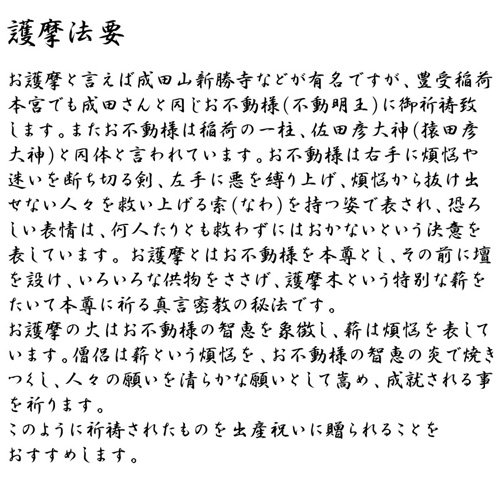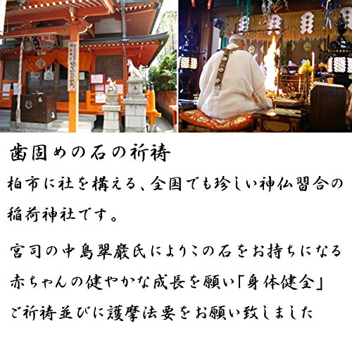 赤ちゃんが生後100日目に行われる儀式を「お食い初め」と言います。「箸揃え」「箸初め」とも呼ばれるほか、「百日(ももか)の祝い」「歯固め」と呼ぶ地域もあるそうですが、この時に使うのが「歯固めの石」です。「お食い初めの儀式」の時に丈夫な歯になるようにと小石を箸で叩き、箸を口に付ける真似をします。 御用意致しました「歯固めの石」は日本では珍しい神仏習合の神社、豊受稲荷本宮にて始めにご祈祷頂き、その後護摩法要の「御火加持」(おひかじ)に石を当てて頂き、お不動様の御霊徳を頂きました。