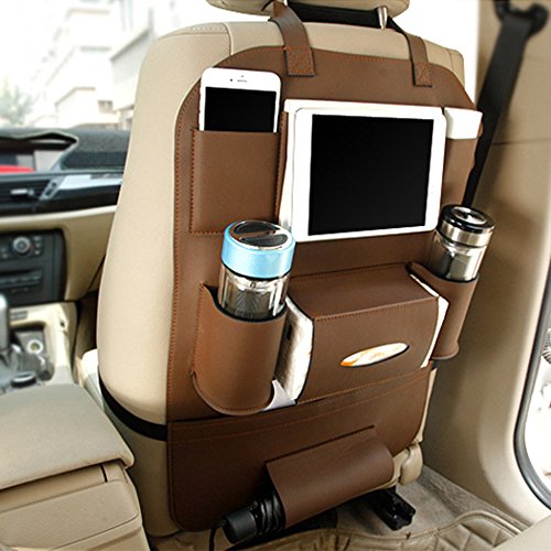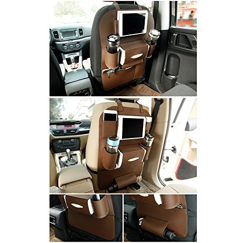 カーシートバックオーガナイザー、マルチポケットPUレザーカーシートバックトラベルストレージバッグボトルティッシュボックスのタブレットホルダー、自動シートバックプロテクター、キックマット、カーオーガナイザー (褐色)