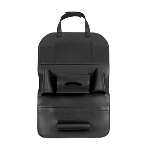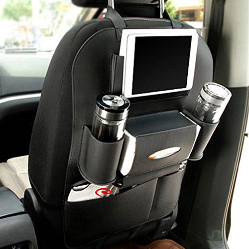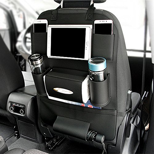 カーシートバックオーガナイザー、マルチポケットPUレザーカーシートバックトラベルストレージバッグボトルティッシュボックスのタブレットホルダー、自動シートバックプロテクター、キックマット、カーオーガナイザー (ブラック)