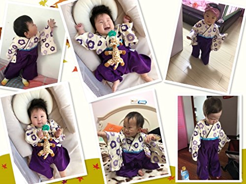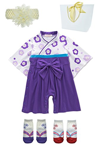 ギフトバッグ付き 巫女服風デザイン ベビー用ロンパース 靴下2足 ヘアバンド付き(紫90cm)
