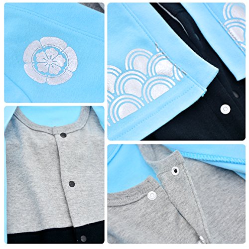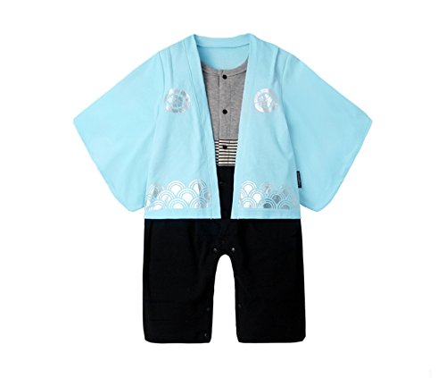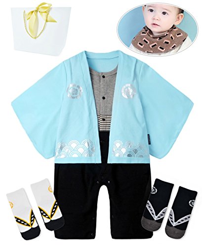 ギフトバッグ付き ベビー キッズ 袴風 カバーオール ロンパース 男の子 よだれかけ ソックス2足付き ブルー90 cm
