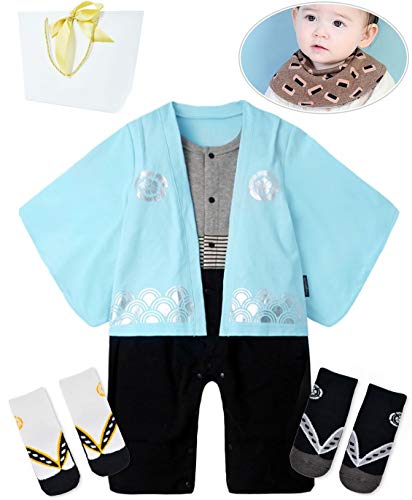 ギフトバッグ付き ベビー キッズ 袴風 カバーオール ロンパース 男の子 よだれかけ ソックス2足付き ブルー80 cm