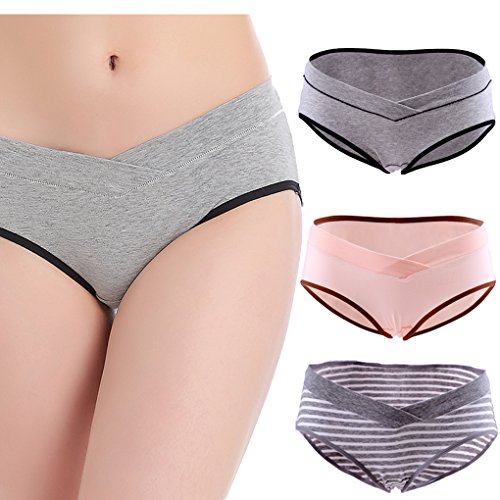 マタニティ下着,KUCI女性の妊娠中のマタニティ ショーツ ローライズU字型 産前 産後 綿,3枚組 (XL, Grey+ Grey Strip+Nude/3Pack)