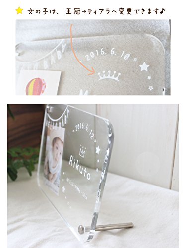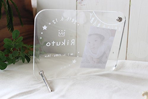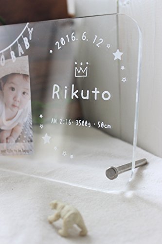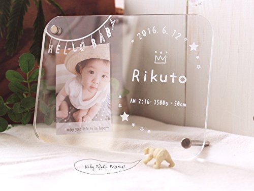 **ご覧頂き誠にありがとうございます。 キラキラ星のかわいいデザイン☆彡 インテリアになじみやすいナチュラルなベビーフォトフレームです^^* 小さな産声をあげた日…思い出を形にしませんか♪ ご出産祝いや内祝いにもオススメ♪ アクリル素材に お子様のお名前・お誕生日・出生時刻・身長・体重をレーザーで彫刻致します。 ★ベビー以外にも、 新築祝いナド ご希望のメッセージを お入れして世界に1つのフォトフレームをお作り致します♪ 彫刻していますので色あせることなく永く飾っていただけます(*^-^*) ★ギフトラッピング承ります アクリルプレートを2枚重ねた構造。 ビスをはずして→写真をプレートに挟む →再びビスを固定して完成です♪ ■サイズ:130×180mm 厚み:約6mm ★お届けまでの流れ★ ●彫刻する文字(お名前・お誕生日・出生時刻・身長・体重) をご連絡下さい ↓ レイアウトを作成させていただき、メールにて送らせていただきます。 ↓ レイアウト図OKのお返事 ↓ 彫刻 1つ1つ心をこめてお作り致します*^^* ご不明点がございましたらお気軽にご質問下さい。
