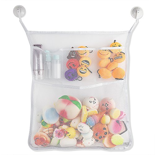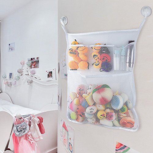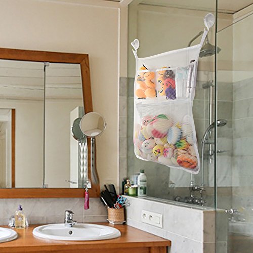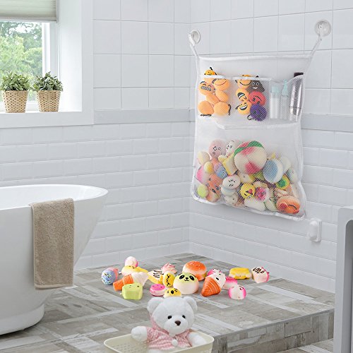 - 【専門なデザイン】浴室のために設計された漏れ穴のデザインです。上に小さいポケットが3つあり、子供のシャンプとボディーソープを入れ、下に一つの大きいポケットが十数個のオモチャが収納出来ます。