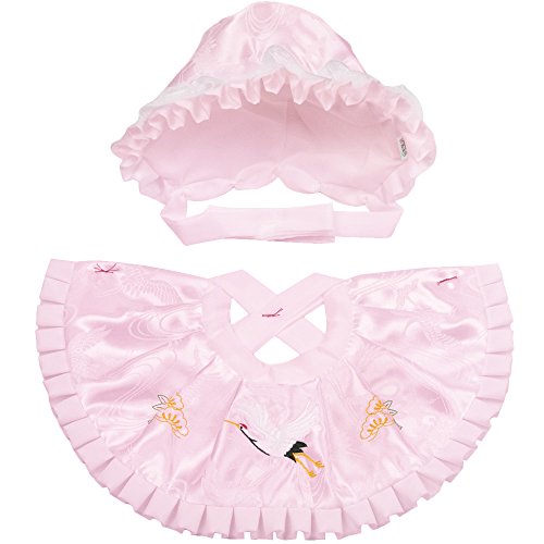 - [色と柄]:帽子:ピンク×地紋入り生地×レース、よだれかけ:ピンク×地紋入り生地×レース×鶴と松の刺繍