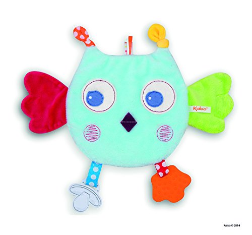 Kaloo Colors Activity Toys My Sweet Doudou Owl- This extra cozy owl provides baby with a sensation that is extremely soft to the touch. This particularly soft toy is exclusively made of the very softest materials and will soothe baby with real cuddles. This owl features knots harkening back to Kaloo's classic security blankets that baby will love to touch as he falls asleep. A fastener is also used to attach the pacifier to ensure that it is never very far from baby. A teething ring soothes his sensitive gums and baby can grab the ribbons and series of elements made for small baby hands to develop fine motor skills. 25 cm, suitable from birth, machine wash (30 degree C), tumble dry low.