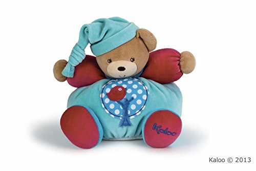 Kaloo Colors Medium Bear with Apple Tree Applique is a cute and cuddly friend for baby. This bear features an aqua nightcap that is great for baby to grasp. The bear's body is aqua with a whimsical apple tree applique.