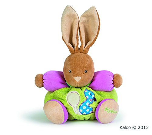 Kaloo Colors Medium Rabbit with Squirrel Applique is a fashionable rabbit featuring lime green body and hot pink arms and legs. It's long floppy ears are great for baby to play with while falling asleep. Adding to its whimsical look is a cheerful blue pol