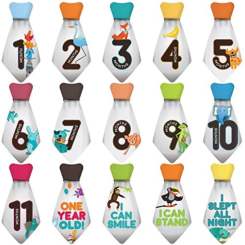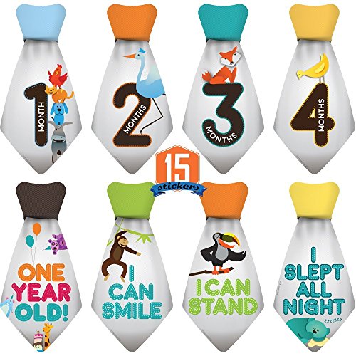 Original Stick'Nsnap (TM) 15 Baby Monthly Necktie Onesie Stickers - "Happy Animals" (TM), Gray. Milestones for 12 Months +3 Bonus Milestones - Best Baby Shower Gifts! [並行輸入品]