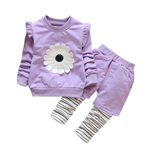 Karchi幼児子供 トップス+パンツ服セット 赤ちゃん 女の子可愛い 少女 衣装 フード付き ストライプ Tシャツ トップス+パンツ服セット (80, 紫)