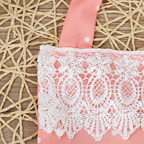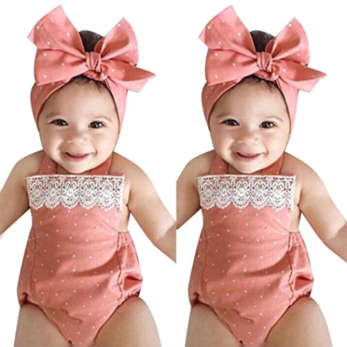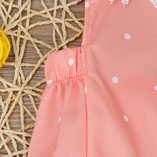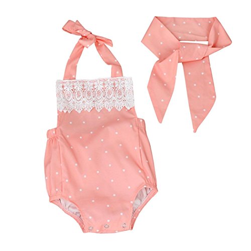 Karchi ベビー服 女の子 ロンパース 可愛い 袖無し ドット柄 レース ストライプ カバーオール+ヘアバンド 2点セット 春夏服 誕生日 お出かけ パーティー 0-24ヶ月設定 ピンク (80)