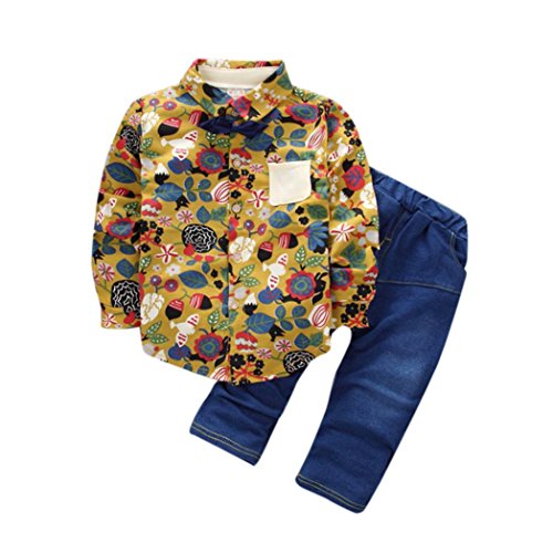 男の子 ベビー服 Karchi 2点セット Tシャツ+ジーンズ 縞柄 かっこいい ベビー服 プレゼント 子供服 出産祝い お誕生日 春秋 パジャマ 普段着 (90, 黄色い)