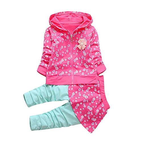 Karchi 女 幼児カジュアル ファション 新品 子供 赤ちゃん 女の子 装飾花 フード付き コートトップス+パンツスカート 服セット (80, ローズ)