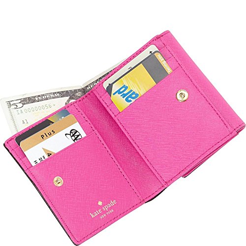 A saffiano leather Kate Spade New York wallet with a polished logo stud at the snap front pocket. Bifold design with 6 card slots and lined cash pocket. kate spade was founded in 1993 with six simple handbags that shook up what had been a quiet accessories category.??Fifteen years and a handbag revolution later, wit and playful sophistication are hallmarks of everything 'kate spade,' a world that now includes a broad array of products.??A strong sense of personal style and a passion for color set the tone for each kate spade collection. kate spade continues to find inspiration in the everyday and the unpredictably elegant, bringing a graceful, exuberant approach to style and living.